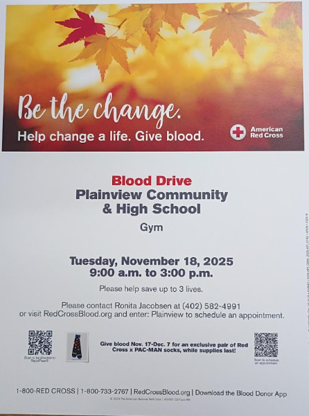 Plainview FCCLA will host a community blood drive with the American Red Cross on Tuesday, November 18th from 9 am–3 pm at the Plainview High School Tartan Gym.