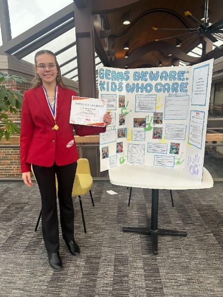 Scarlet Torrey earned a gold medal and title of District Champion in her Focus on Children Level 2 Event. She was required to complete a project working when children and then create a display board and 10-minute presentation covering her project. Following the presentation, she was interviewed by the judges and answered questions over her project “Germs Beware: Kids Who Care!”. Jaden May earned a silver medal and District Runner-Up in Chapter Service Display. Her event required her to organize and complete a service project with the chapter and then create a display board and 10-minute presentation covering her project titled “FCCLA Gives Life”. An interview session with the judges followed the presentation.